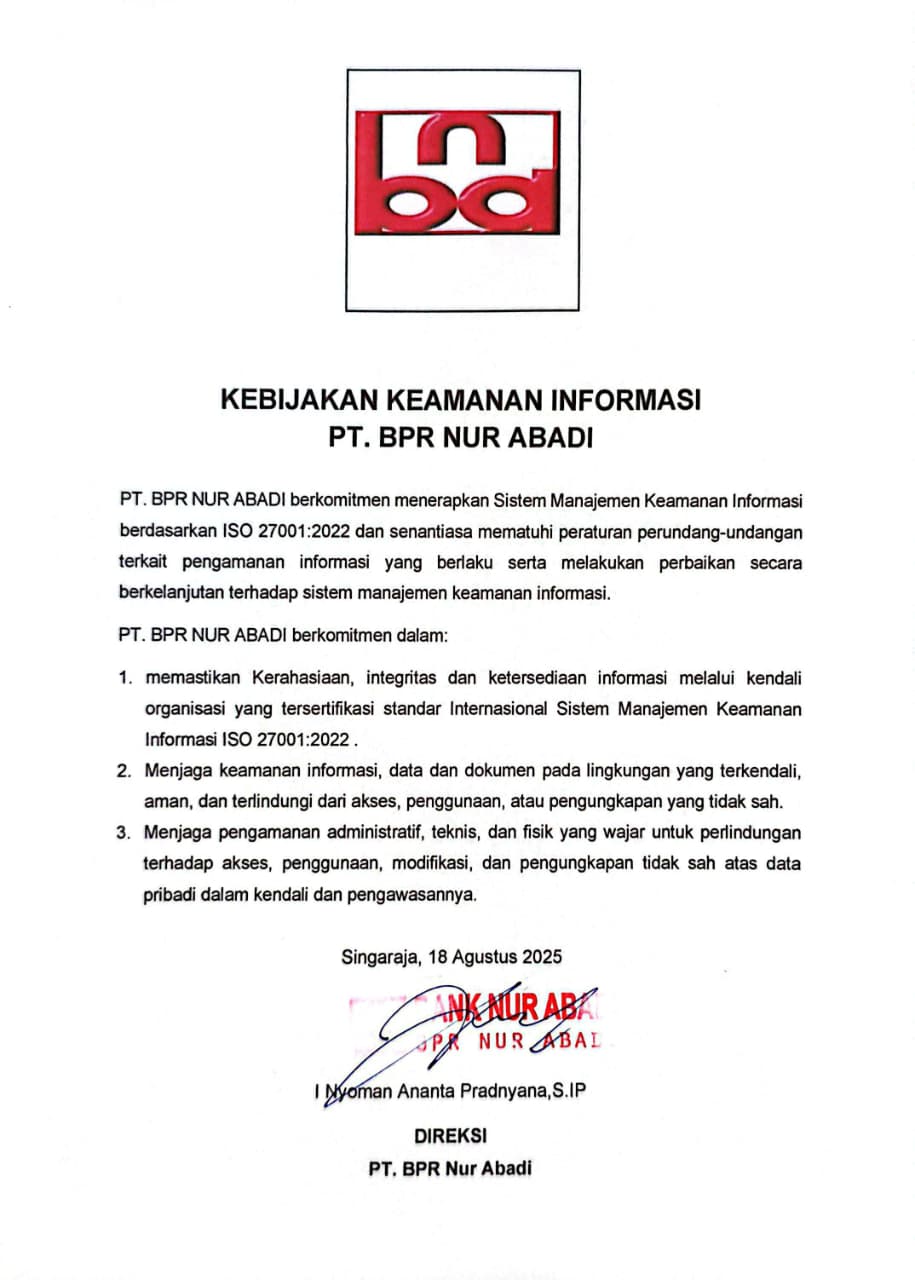 BPR Nur Abadi berizin dan diawasi oleh Otoritas Jasa Keuangan & Bank Indonesia